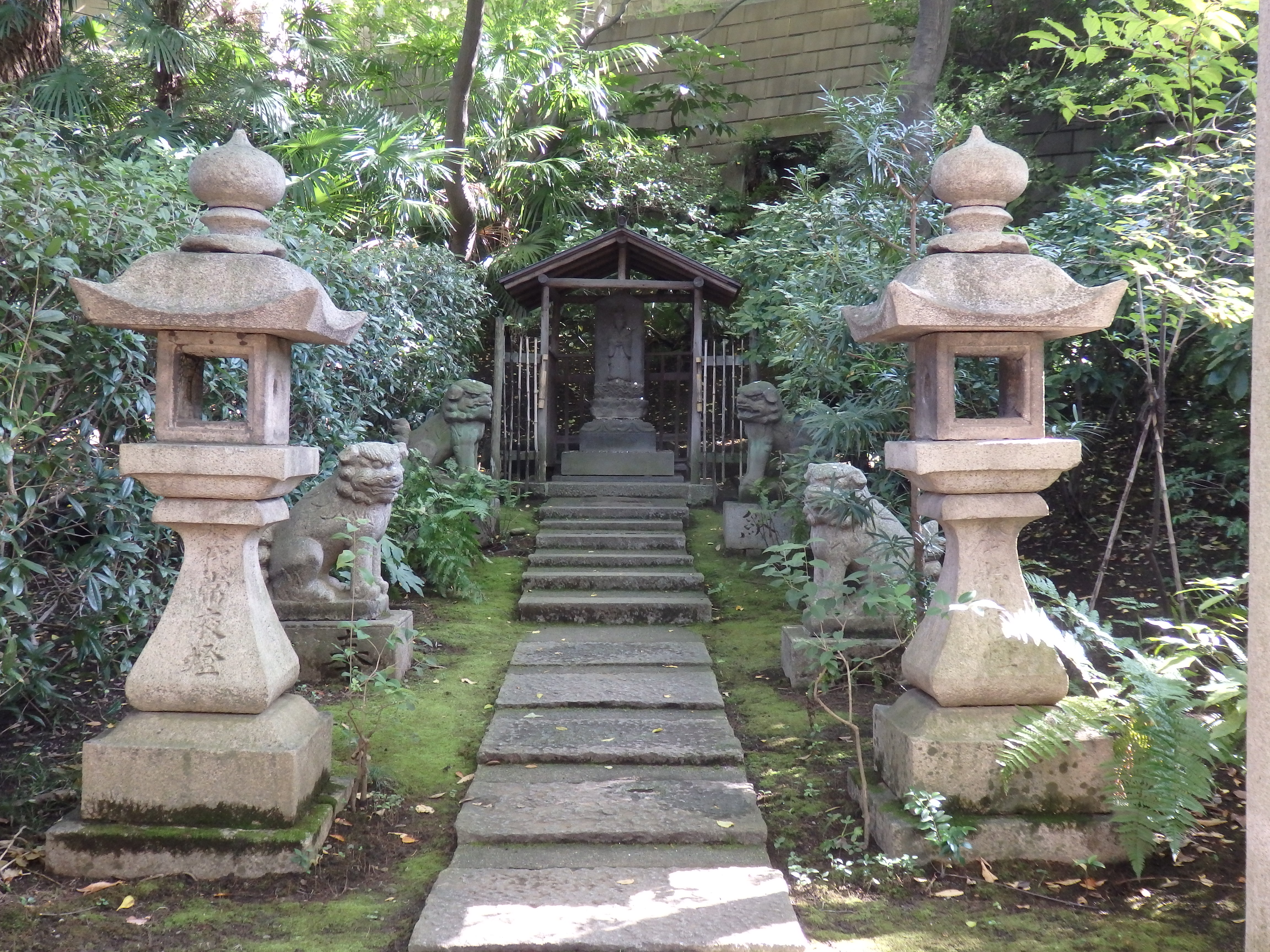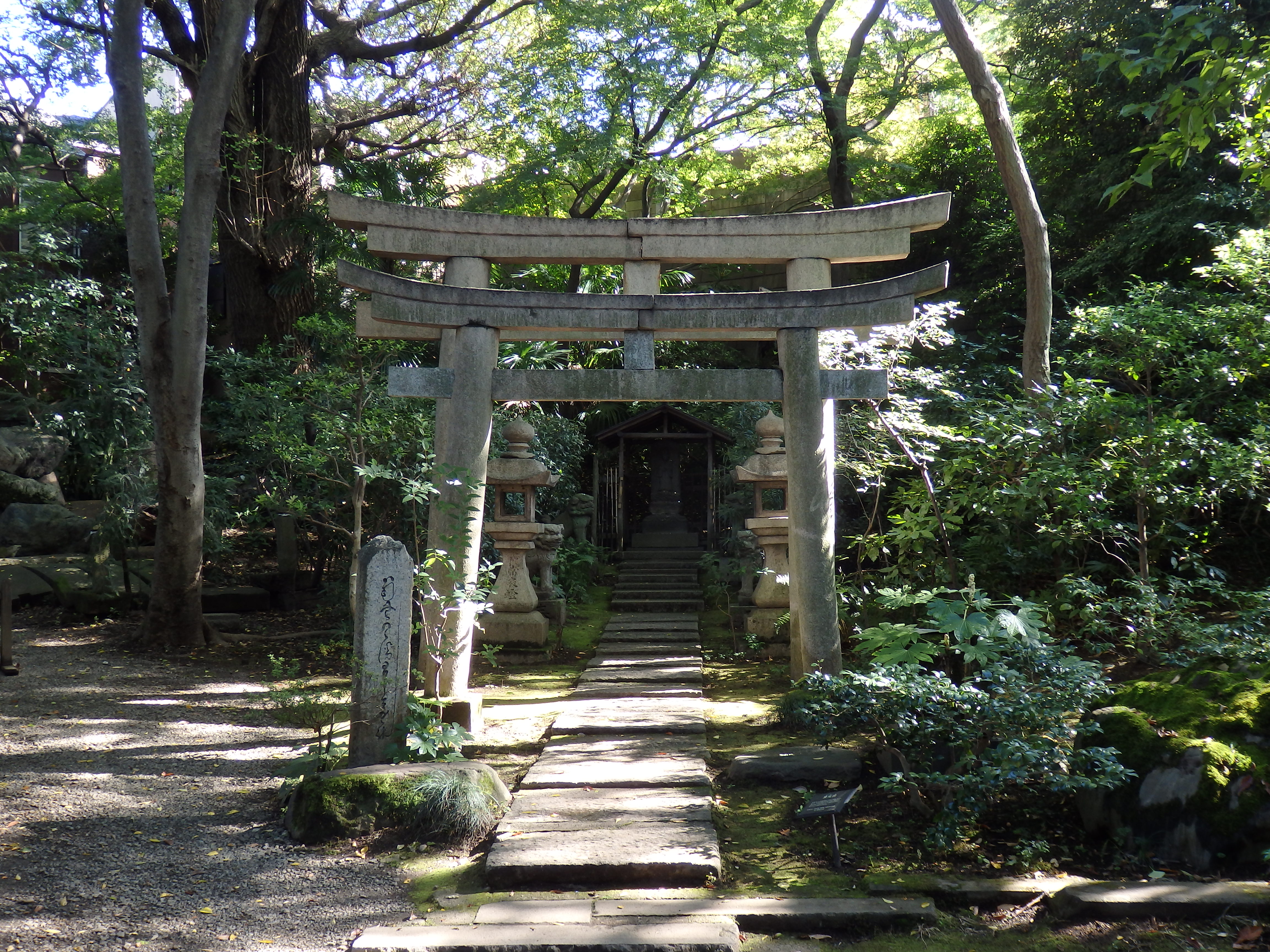 根津美術館庭園は八景からなり、月の石船、弘仁亭の燕子花(こうにんていのかきつばた)、東熊野、ほたらか山、薬師堂の竹林、披錦斎(ひきんさい)の紅葉、吹上の井筒、菅原道真公(唐渡天神)を祀るといわれている天神の飛梅祠(てんじんのひばいし)がある。