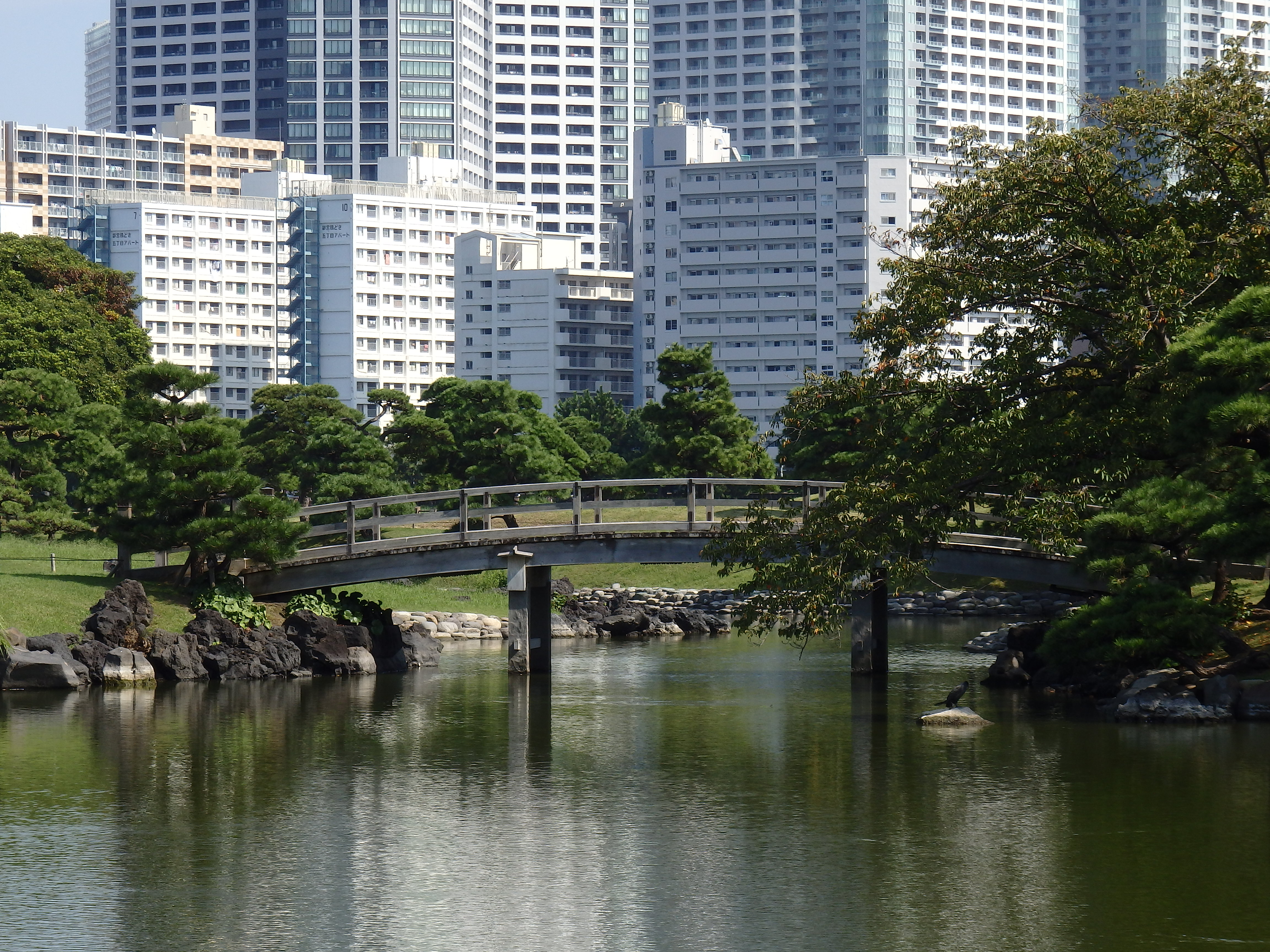 道順は、旧芝離宮恩賜庭園と汐留ビルディングの間の道を高速側に歩き、海岸通りを左手に曲がりテクテク歩いて行くと浜離宮恩賜庭園中の御門橋に行けます。