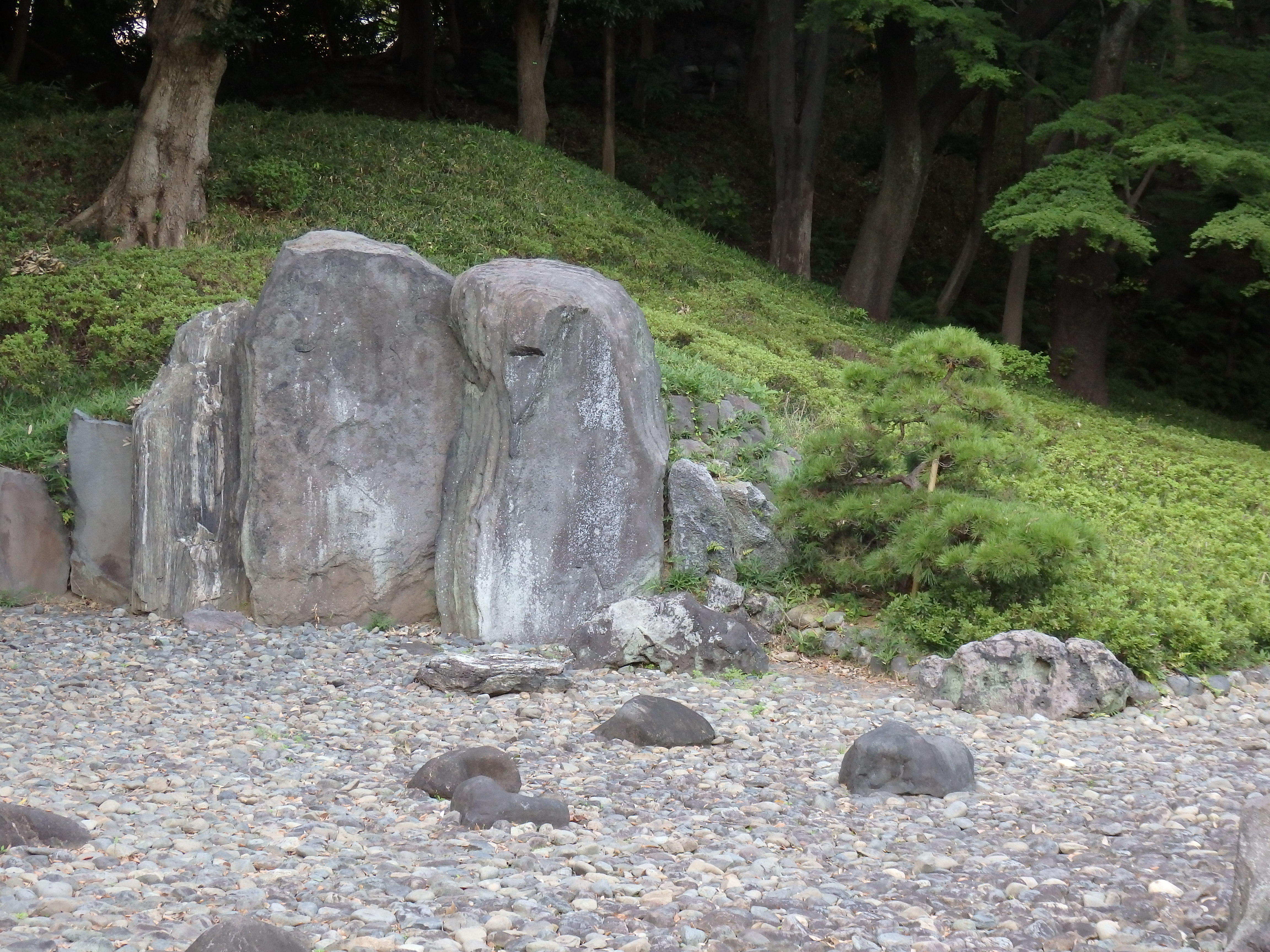 大泉水は、この庭園の中心となる景観で逢菜島と竹生島を配し、琵琶湖を見立てて造られた。昔はこの池で舟遊びもしたと言われている。