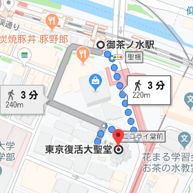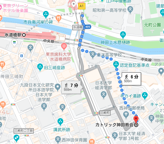 ⇒水道橋駅から白山通りを神保町方面に向かって歩き、UFJ銀行の角を左に曲がると教会が見える。