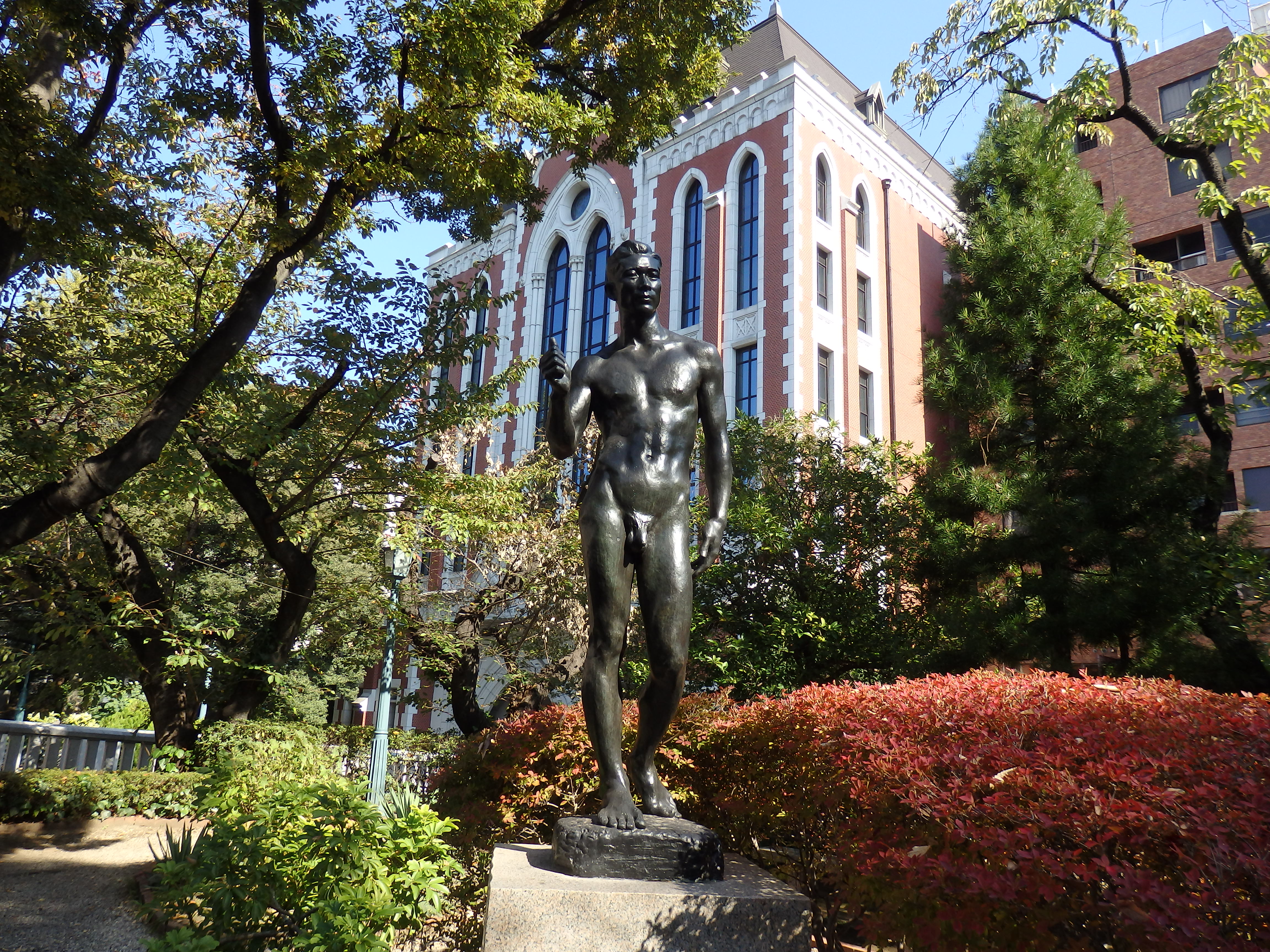 大学構内には、朝倉文夫や菊池一雄の彫塑、イサム・ノグチのオブジェ、猪熊弦一郎の壁画デモクラシーが、西校舎生協食堂の壁面に移設され現在も多くの塾生達は、偉大なアートに見守られながら学生生活を過ごしているのである。