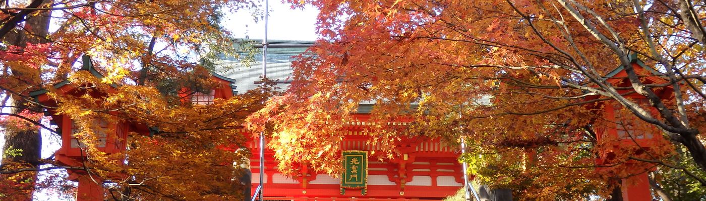 安政元年(1854)青山火事のために類焼し、幕府より造営料などが奉納されたが、幕末の多事と物価高騰のため仮社殿のまま明治維新を迎えた。その後、昭和初年に旧事の盛観に復したが、今次大戦により社殿はことごとく罹災した。しかし戦後はいち早く仮社殿により再興し、その後崇敬者の御芳志等により平成元年から慶安・元禄の江戸権現造りの当社設計絵図を基に御本殿御社殿の造営をはじめ、平成十年の随神門竣工をもって往時を偲ぶ姿に復し、引き続きその他の再建、また境内地の整備に着手し今日に至っている。(境内の掲示より)