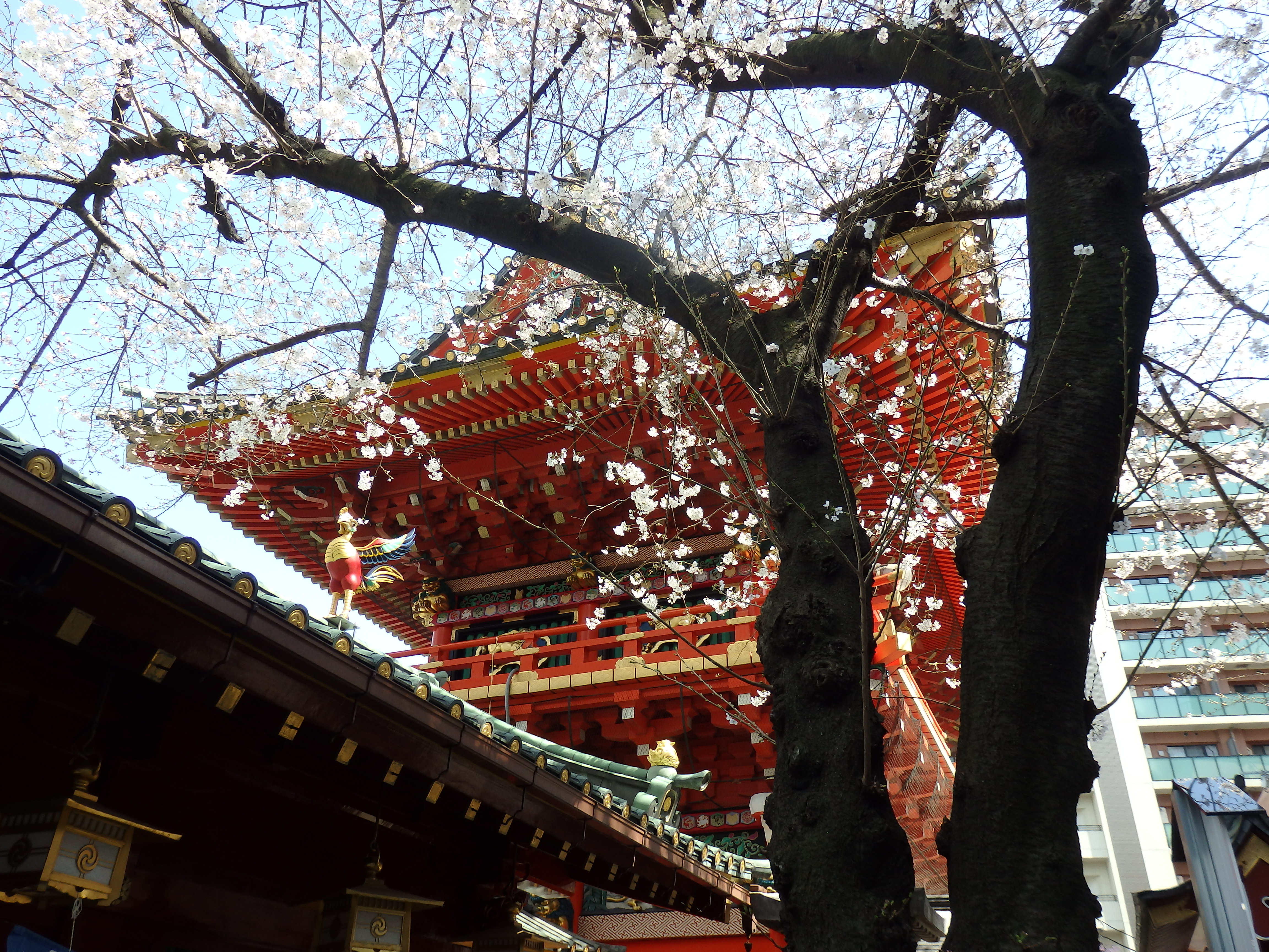 大正12年(1923)、未曾有の関東大震災により江戸時代後期を代表する社殿が焼失してしたが、氏子崇敬者をはじめ東京の人々により、はやくも復興が計画され、昭和9年に当時としては画期的な鉄骨鉄筋コンクリート、総朱漆塗の社殿が再建された。