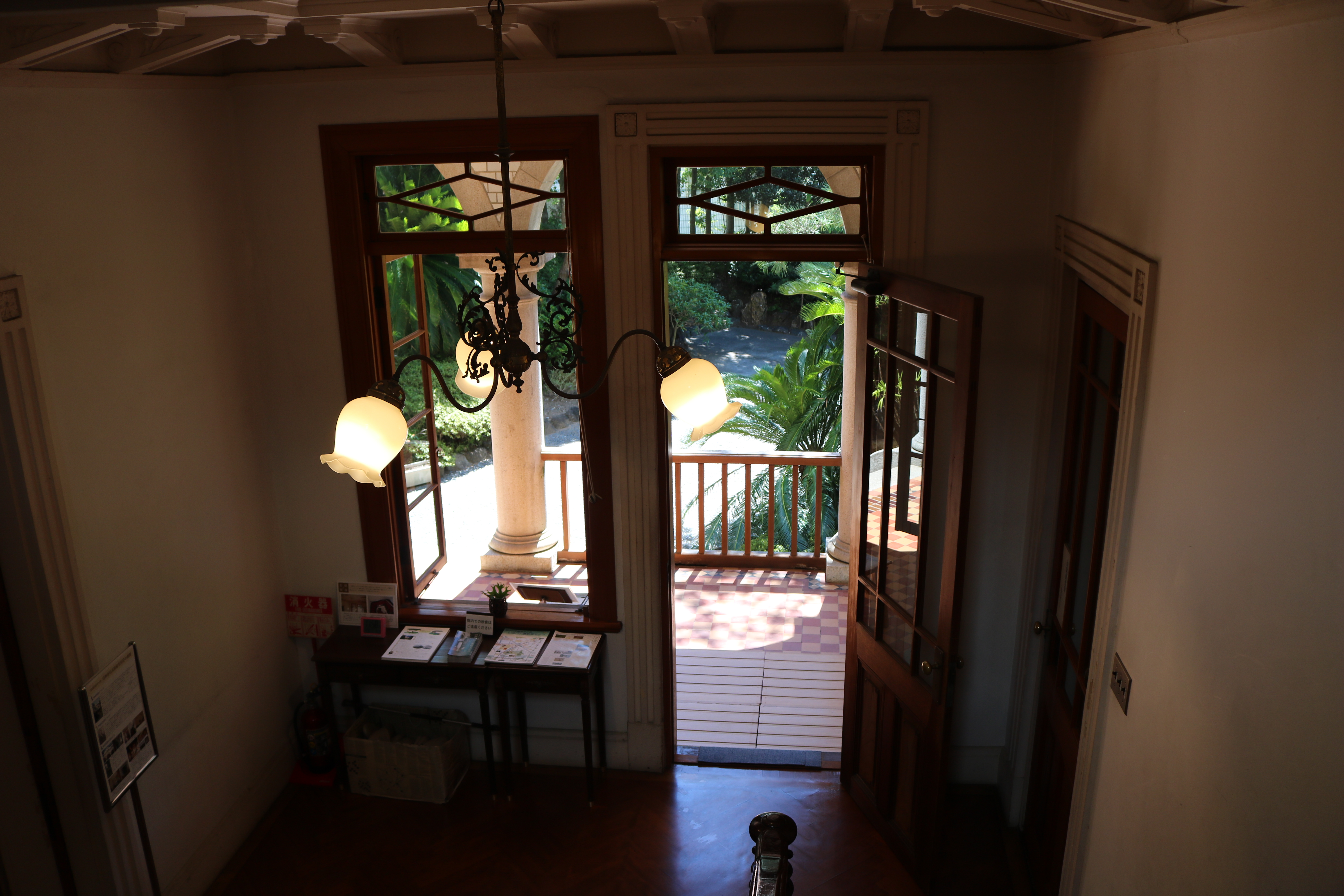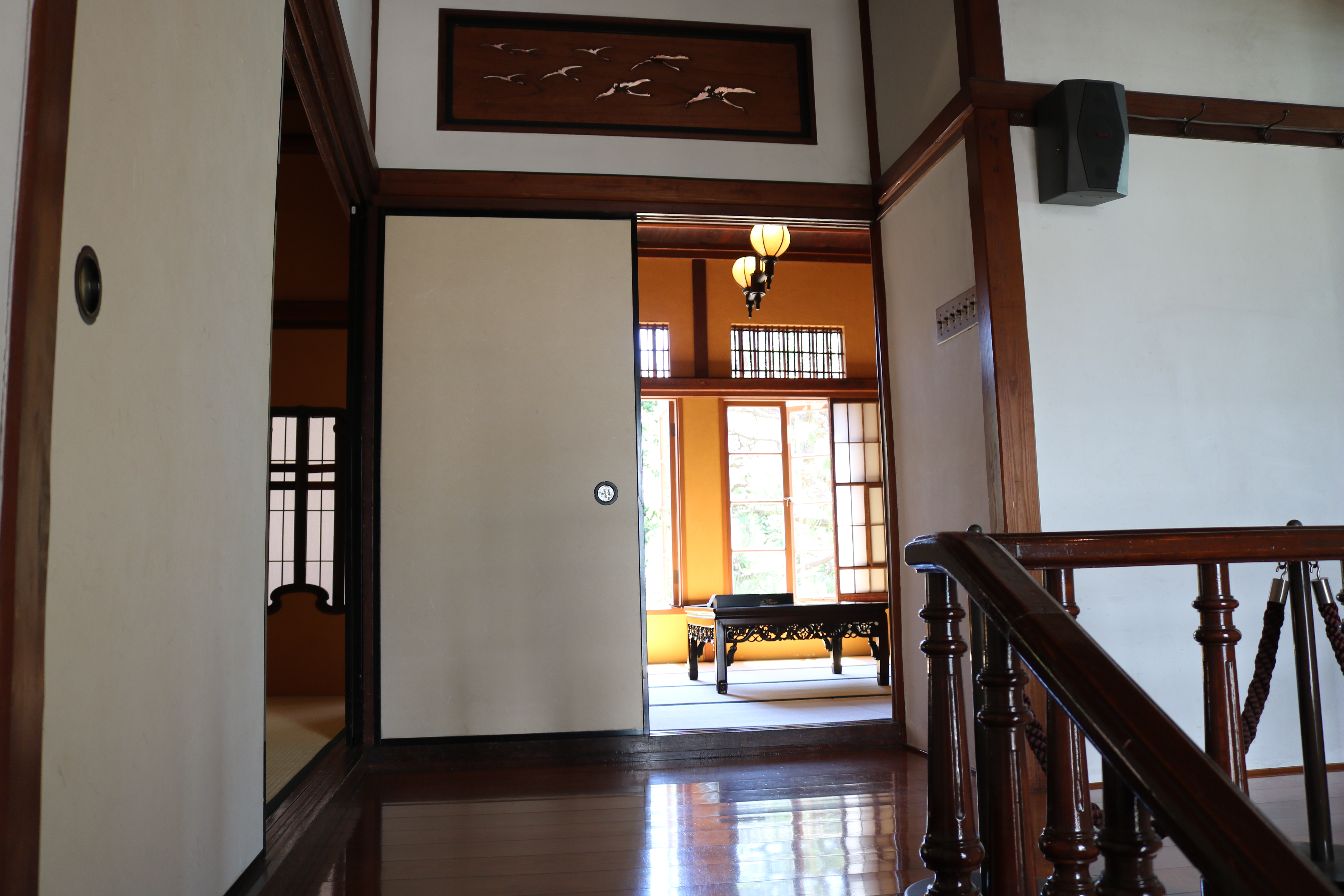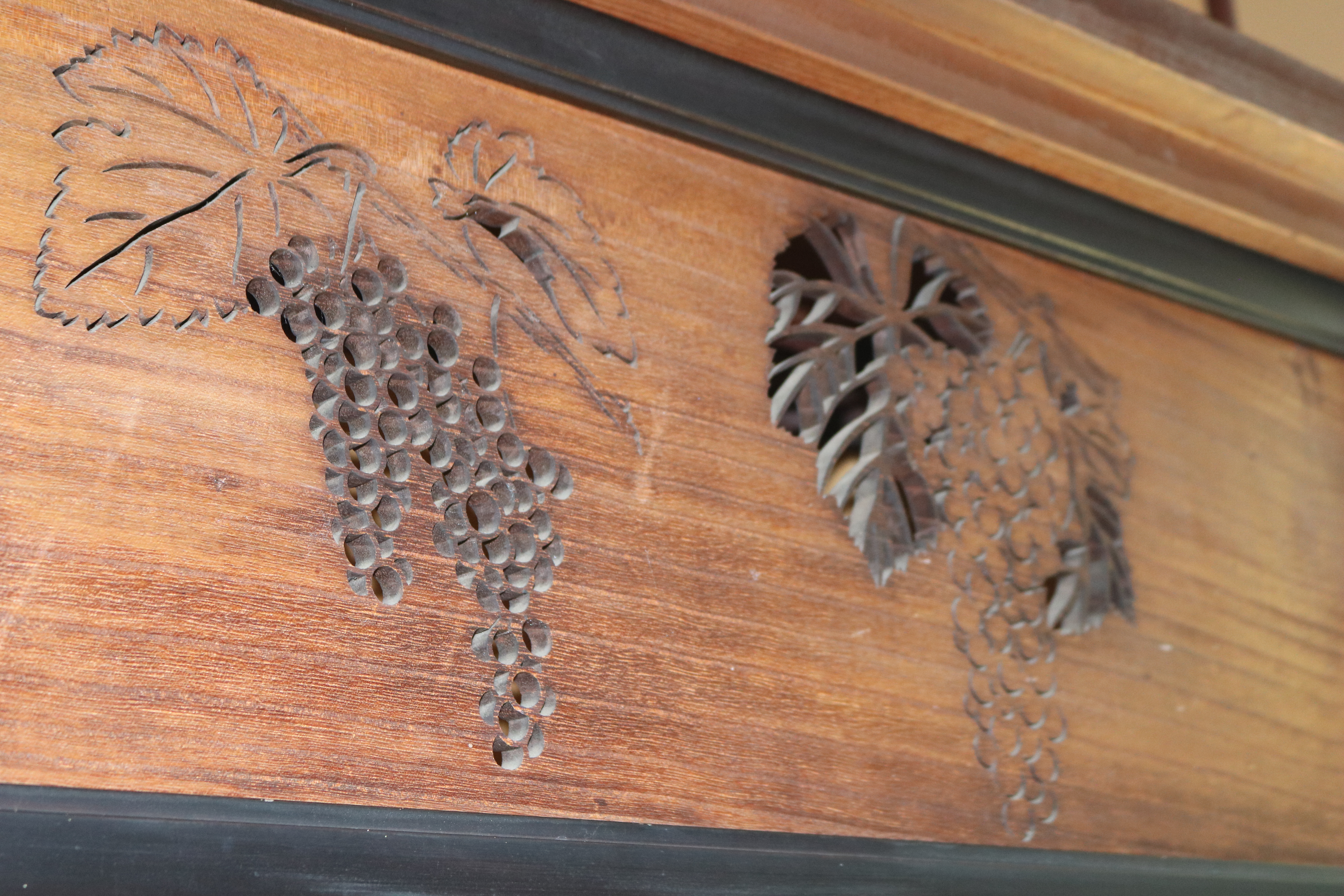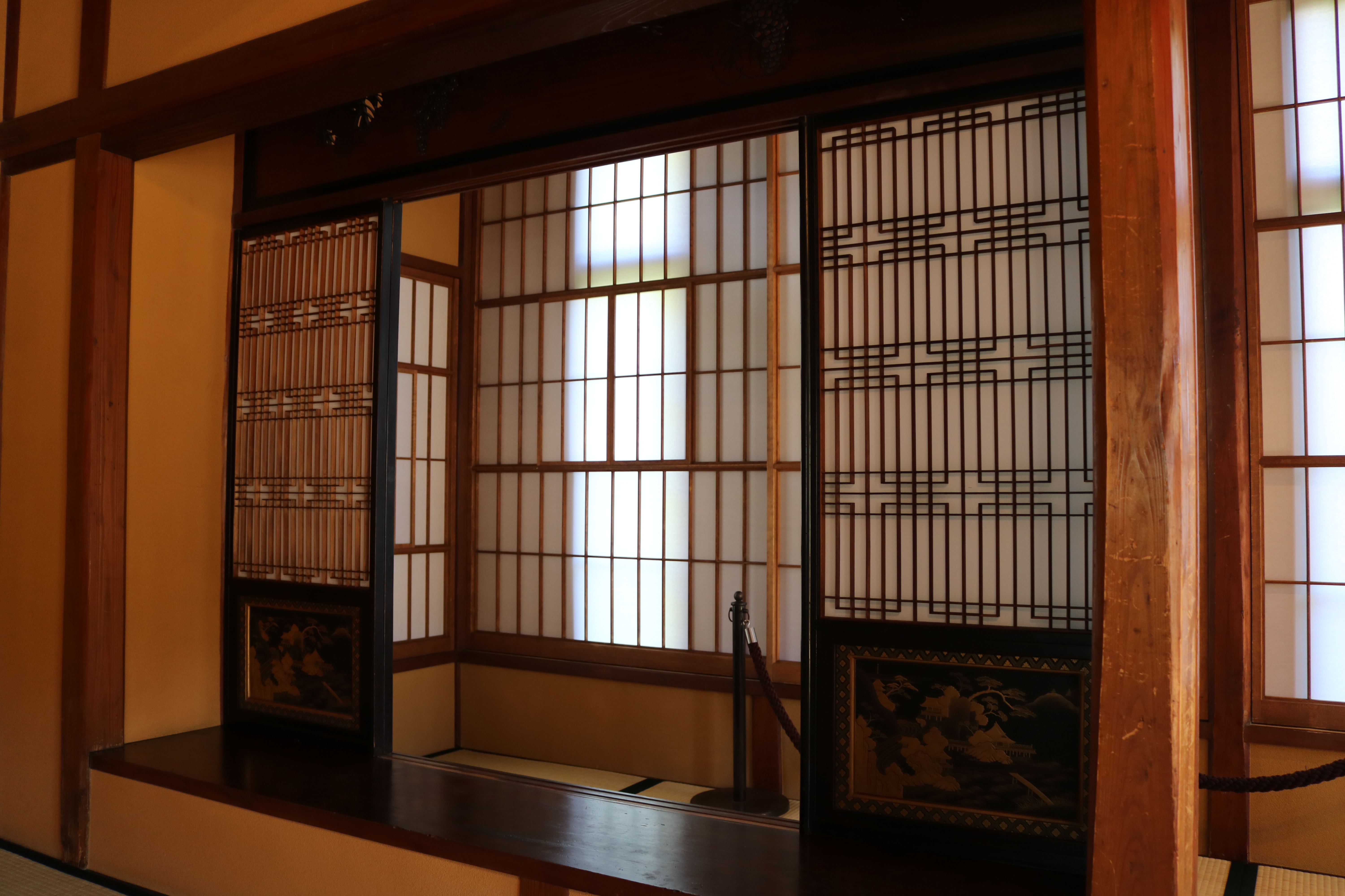 玄関ホールの天井の中心飾りと、和室欄間にはワイン王らしくぶどうがあしらわれており、応接間には大理石をベースにビクトリアンスタイルの絵描きタイルをはめ込んだ暖炉があり、床板は幾何学模様の寄木。