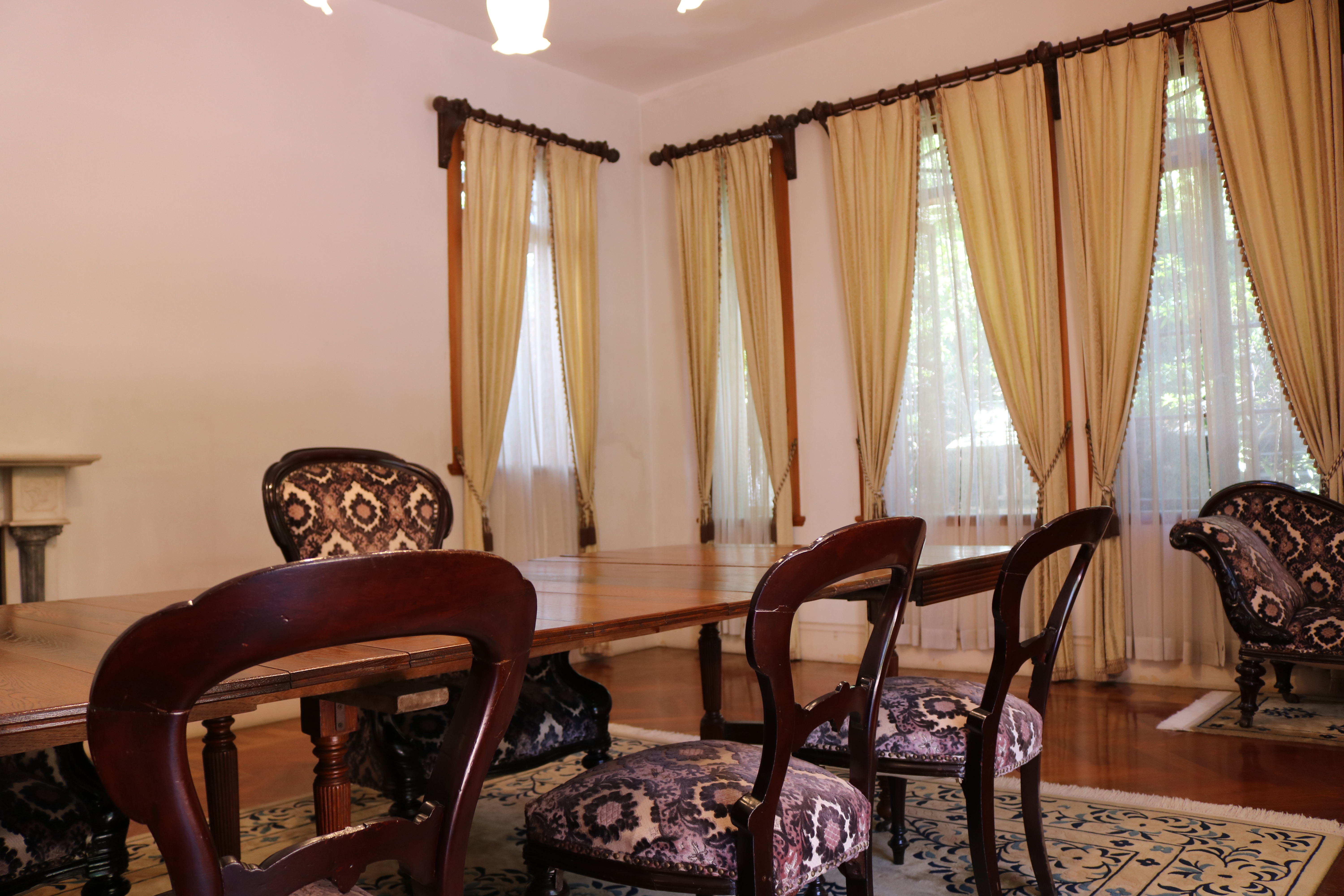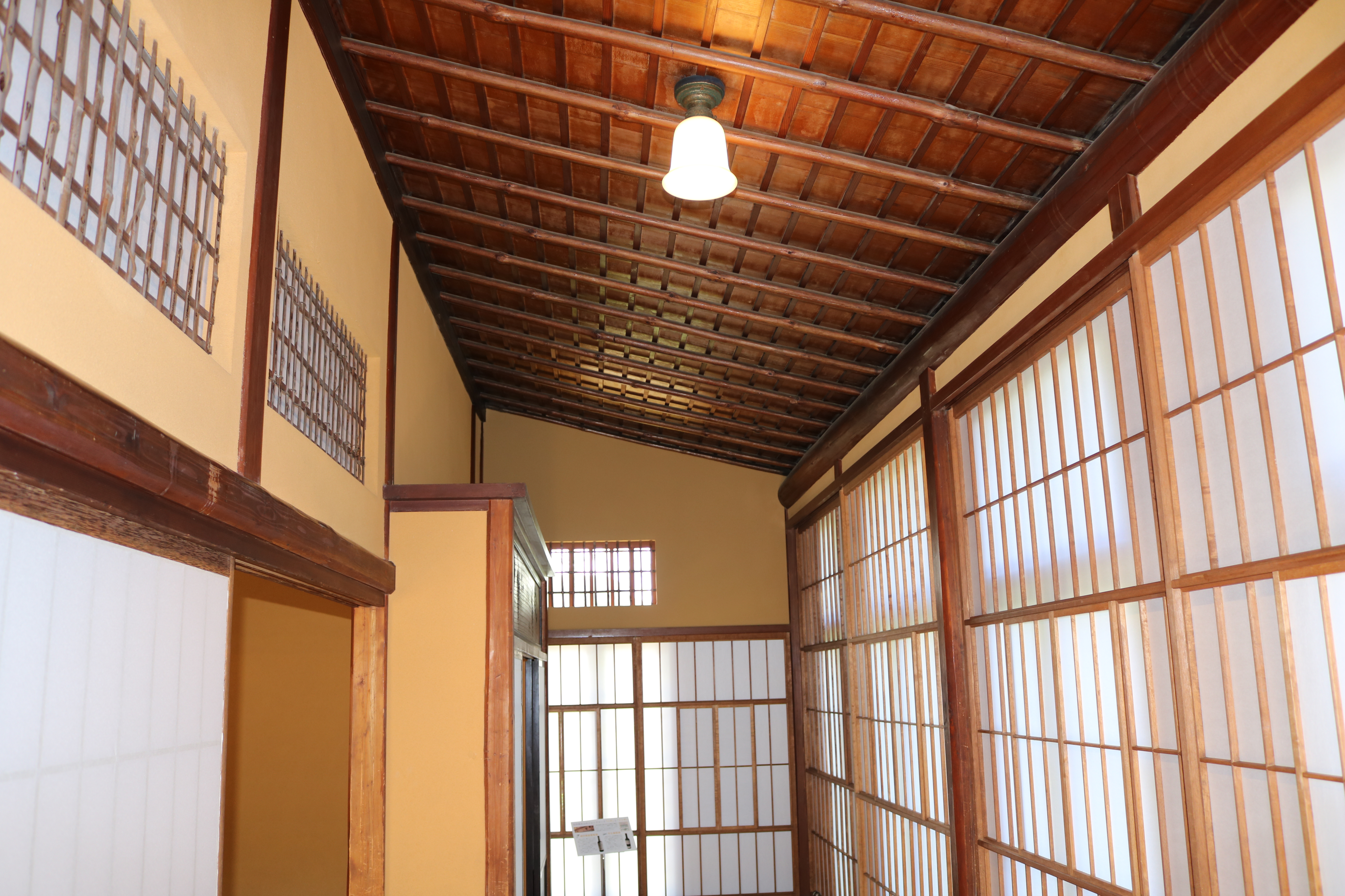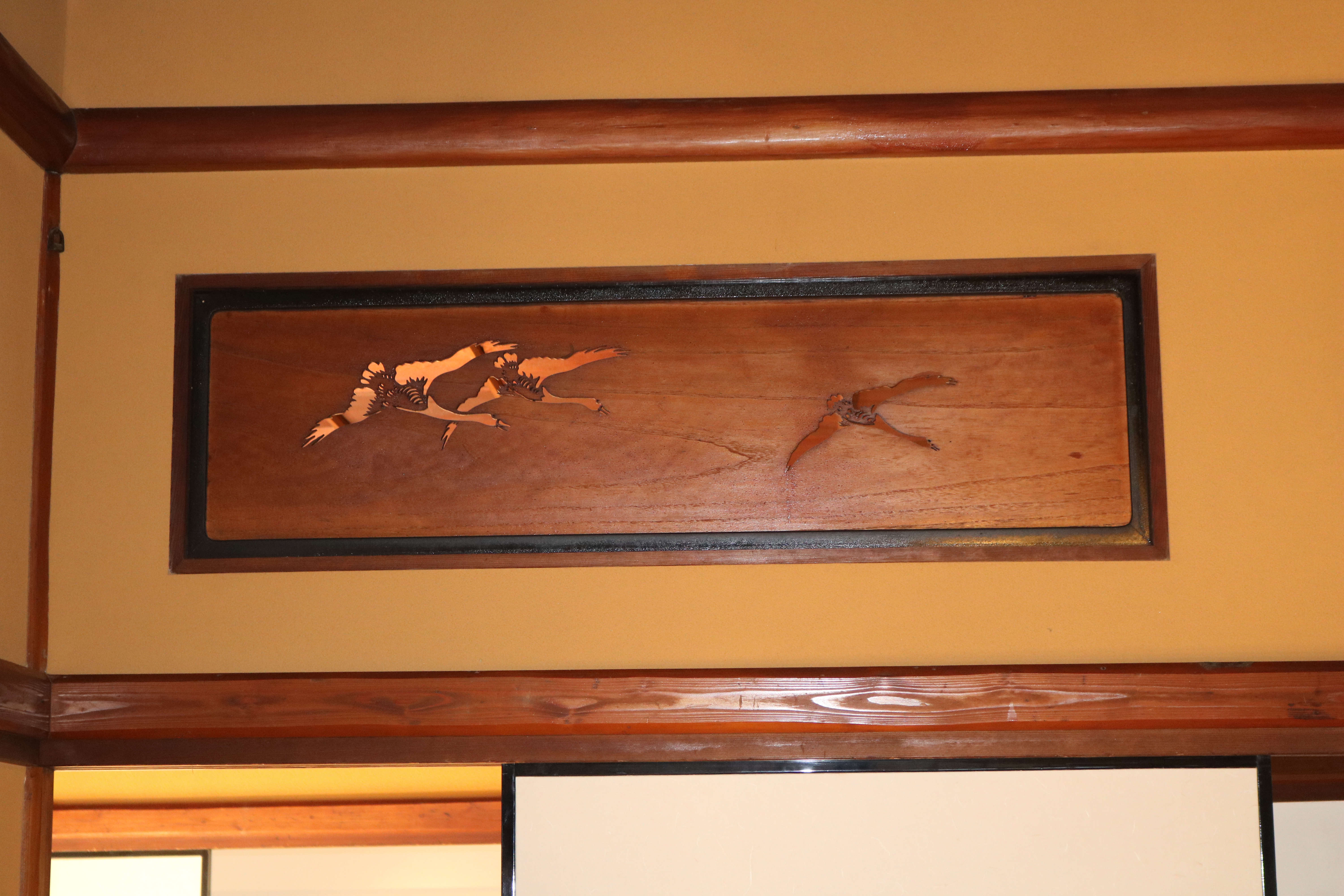 玄関ホールの天井の中心飾りと、和室欄間にはワイン王らしくぶどうがあしらわれており、応接間には大理石をベースにビクトリアンスタイルの絵描きタイルをはめ込んだ暖炉があり、床板は幾何学模様の寄木。