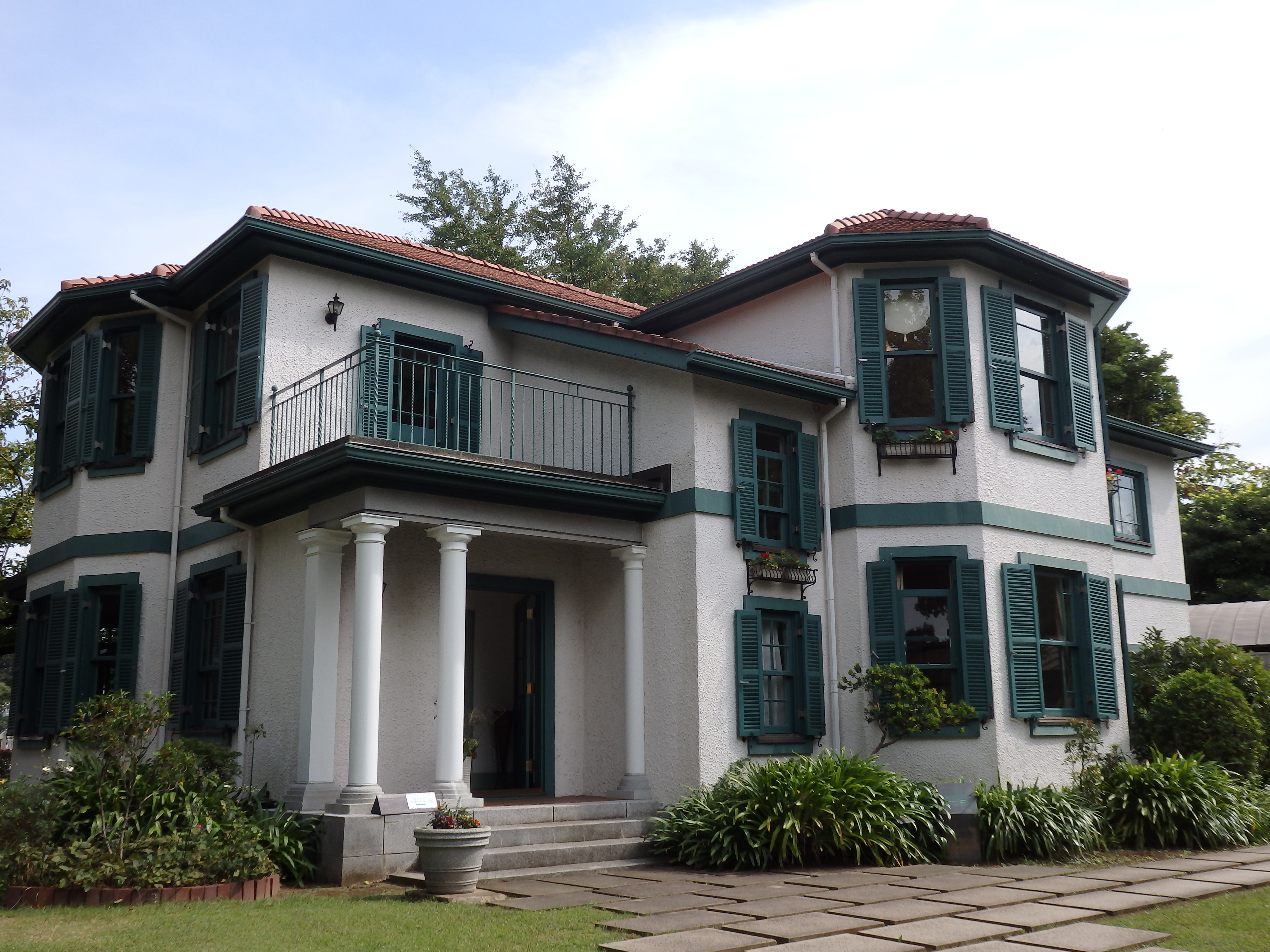外観は正面に中央にベイウィンドウが設けられ、1階2階とも張り出しており、1階2階の境界部分に装飾されている緑の縁がアクセントとなっている。真っ白なドイツ壁に緑色の鎧戸、赤茶色のフランス瓦の屋根、右脇に付柱左にはトスカナ式の柱を立てる玄関ポーチ。玄関ポーチの上はバルコニーになっている。